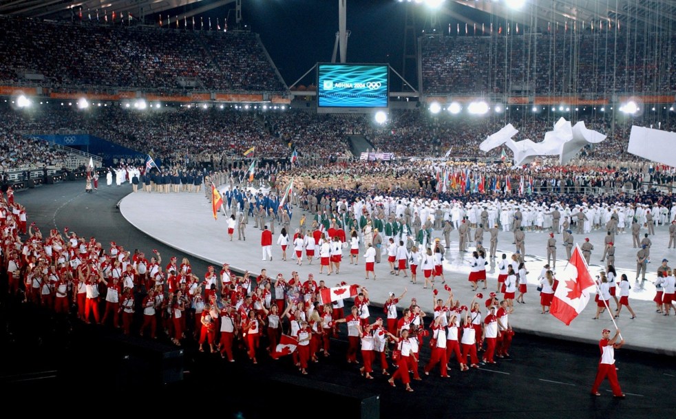 August 13, 2004: The Opening Ceremony of the Games of the XXVIII Olympiad in Athens is held. Two-time Olympic medallist judoka Nicolas Gill carries the Canadian flag.