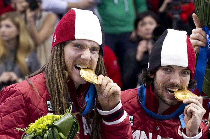Olivier Jean and Charles Hamelin bite their 5000m relay gold medals at Vancouver 2010 THE CANADIAN PRESS/Paul Chiasson