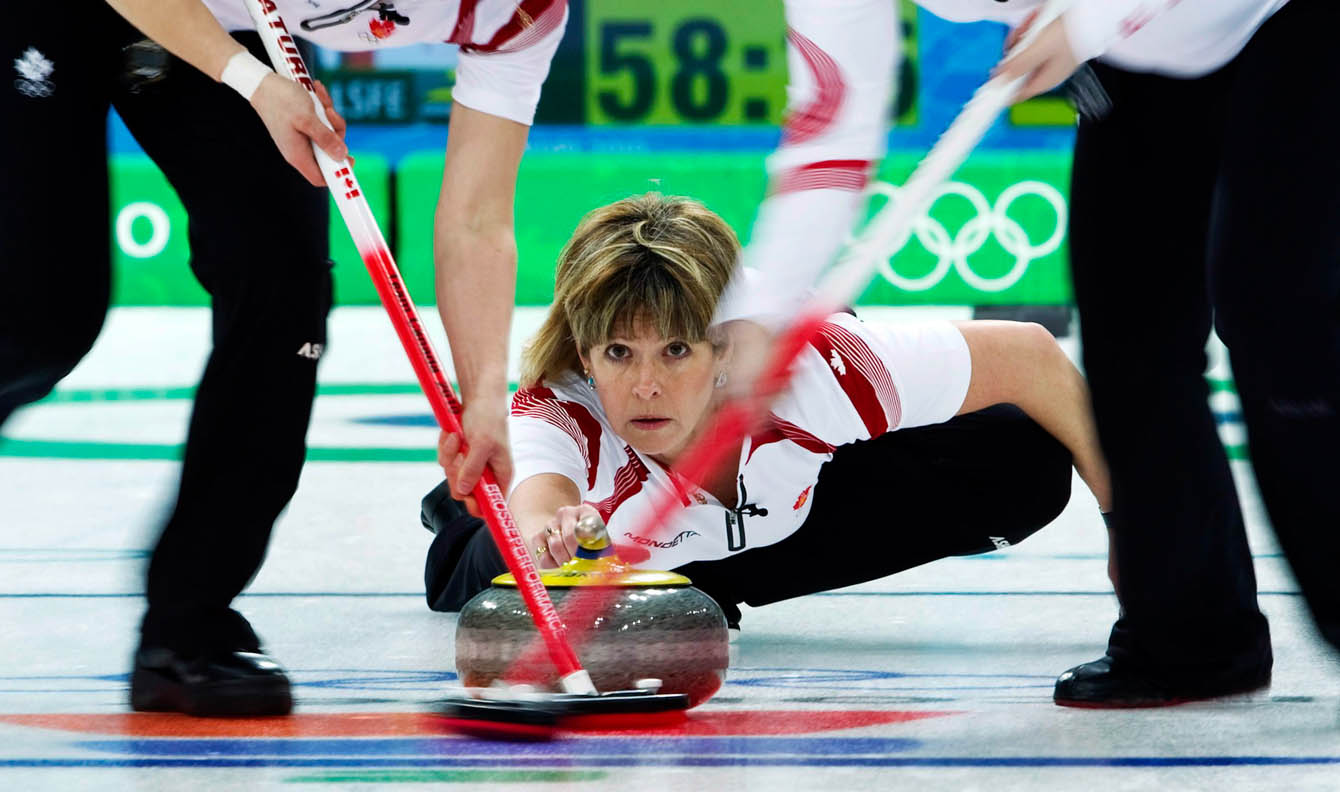 Team Canada second Carolyn Darbyshire, centre, throws her rock as lead Cori Bartel, left, and third Susan O’Connor, right sweep while playing against Team Sweden during Olympic women’s curling action at the Olympic Centre on Monday, Feb. 22, 2010 during the 2010 Vancouver Olympic Winter Games in Vancouver. THE CANADIAN PRESS/Nathan Denett