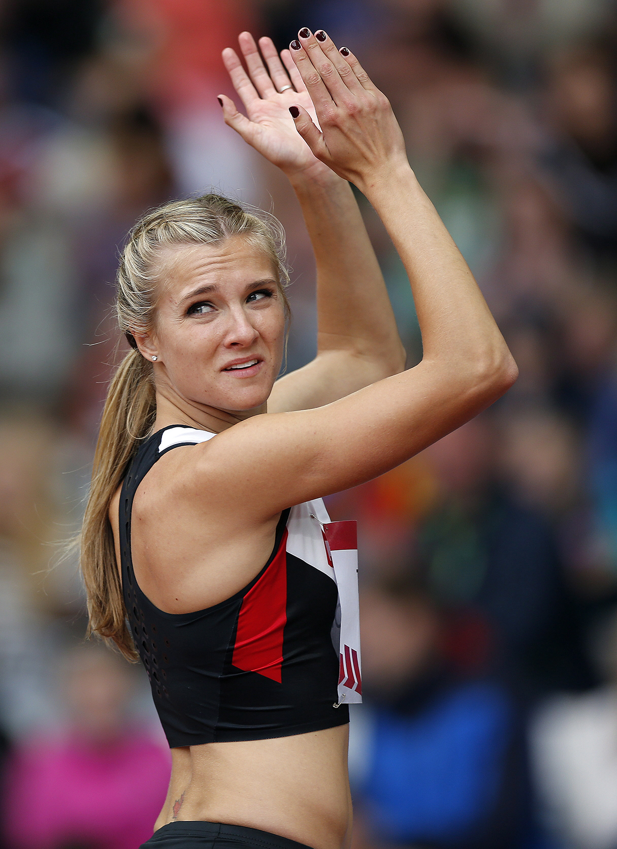 Canada’s Brianne Theisen-Eaton applauds during the Women’s Heptathlon jumping competition at Hampden Park Stadium during the Commonwealth Games 2014 in Glasgow, Scotland, Tuesday July 29, 2014. (AP Photo/Frank Augstein)