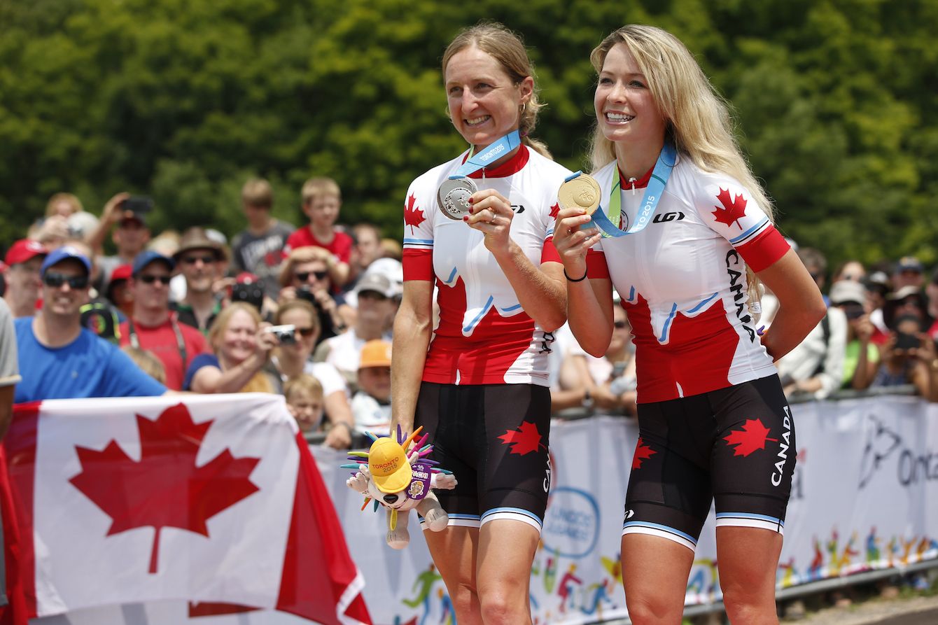 Emily Batty (right) gold medallist and Catharine Pendrel, silver medallist. Women’s mountain bike at 2015 Pan Am Games.