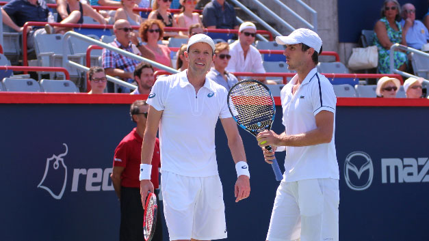 Daniel Nestor and Edouard Roger-Vasselin discuss strategy for the next point during the 2015 Rogers Cup final in men’s doubles.