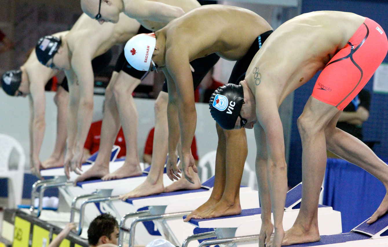 Ryan Cochrane (right in “VIC” cap) at the start of the 400m freestyle on April 7, 2016 (Photo: Patricia Armstrong Corsini via Swimming Canada).