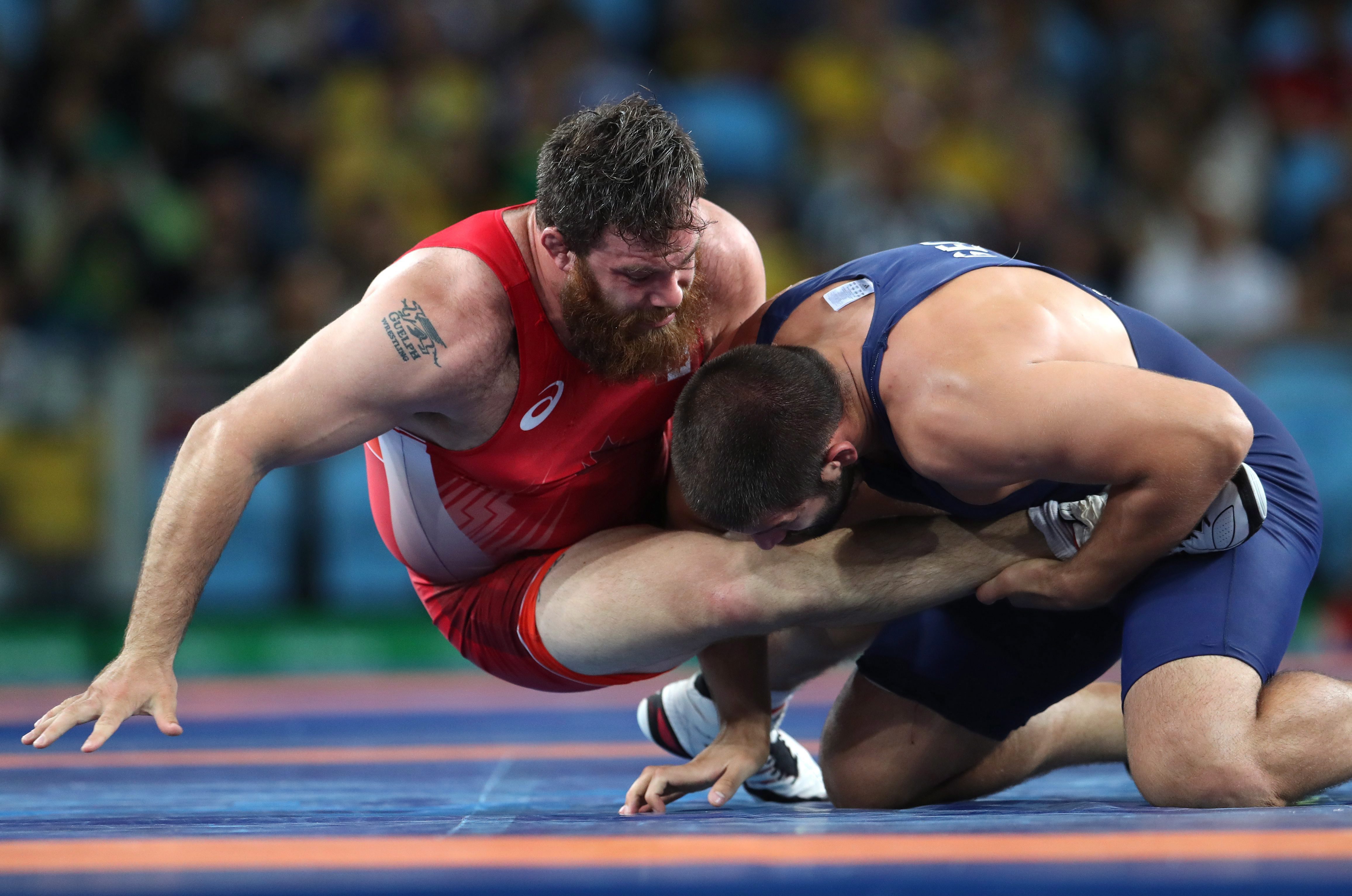 Georgia’s Geno Petriashvili, right, competes against Canada’s Korey Jarvis, left, during the men’s 125-kg freestyle wrestling competition at the 2016 Summer Olympics in Rio de Janeiro, Brazil, Saturday, Aug. 20, 2016. (AP Photo/Petr David Josek)