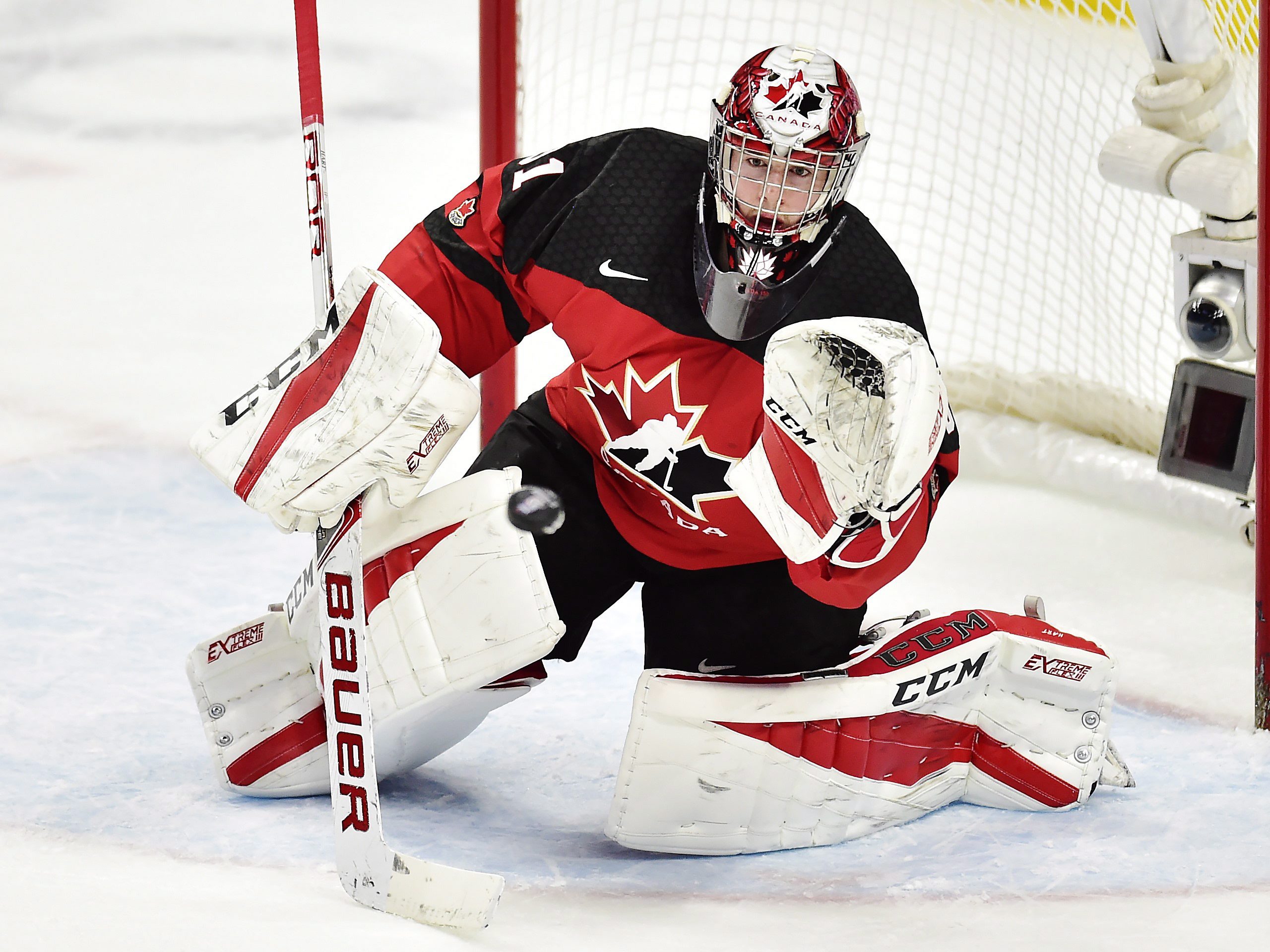 Team Canada goaltender Carter Hart (31) makes a save against Sweden during first period gold medal game IIHF World Junior Championship hockey action in Buffalo, N.Y. on Friday, January 5, 2018. THE CANADIAN PRESS/Frank Gunn