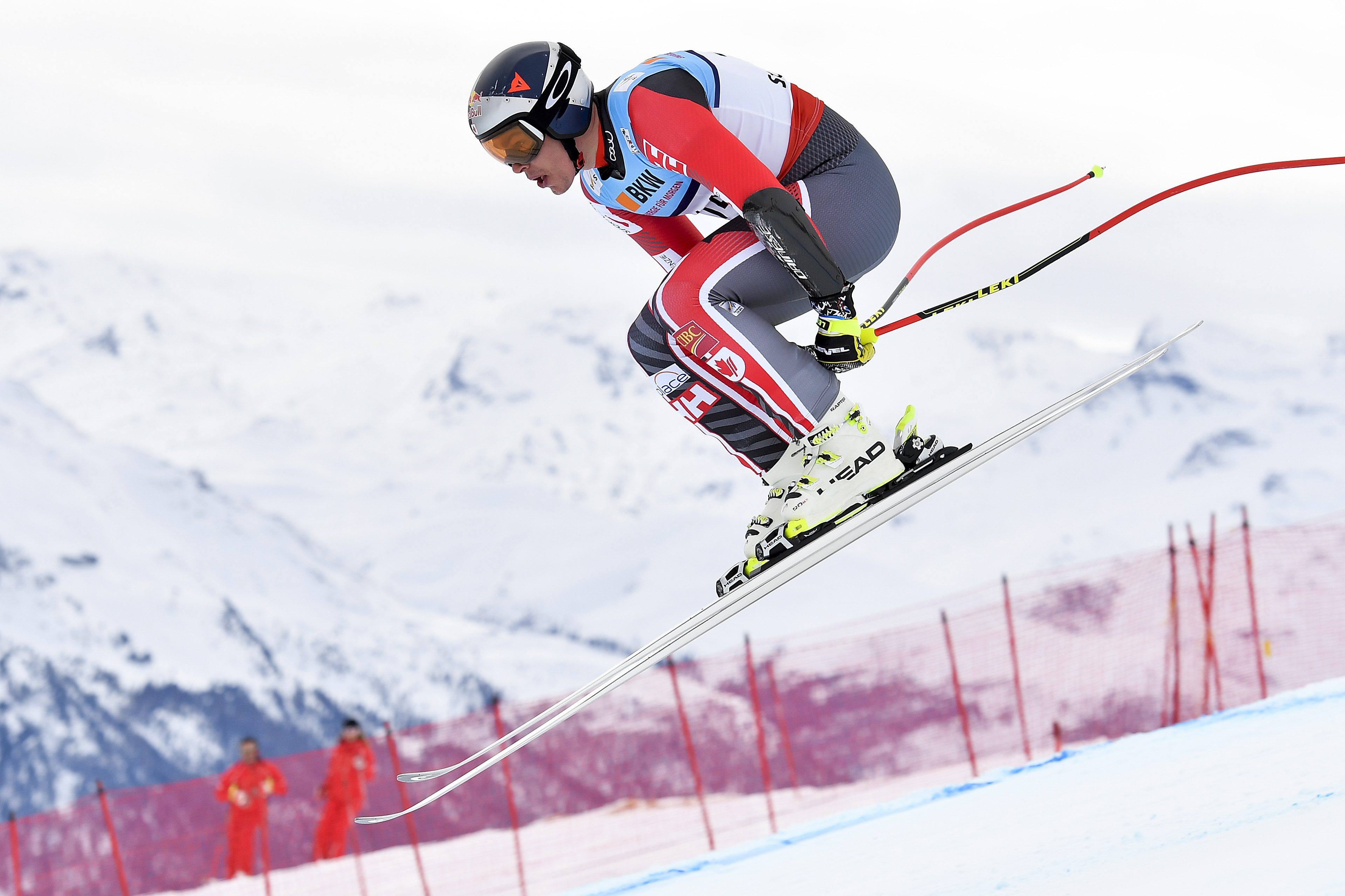 Erik Guay speeds down the course during the men’s Super-G at the 2017 Alpine Skiing World Championships in St. Moritz on Feb. 8, 2017. (Gian Ehrenzeller/Keystone via AP)
