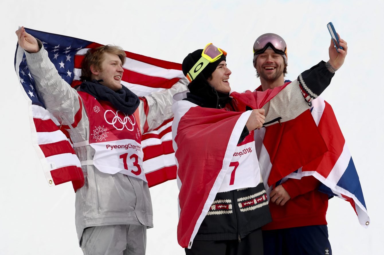 Gold medallist Sebastien Toutant of Canada, centre, takes a selfie with silver medallist Kyle Mack of the United States, left, and bronze medallist Billy Morgan of Great Britain celebrate following the men’s snowboard big air final at the 2018 Winter Olympic Games in Pyeongchang, South Korea, Saturday, Feb. 24, 2018. THE CANADIAN PRESS/Jonathan Hayward