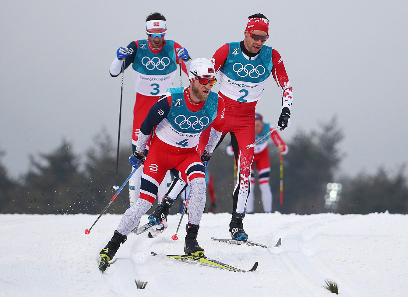 Alex Harvey (2 bib) with a pair of Norwegian skiers in the 50km mass start at PyeongChang 2018 (CP).