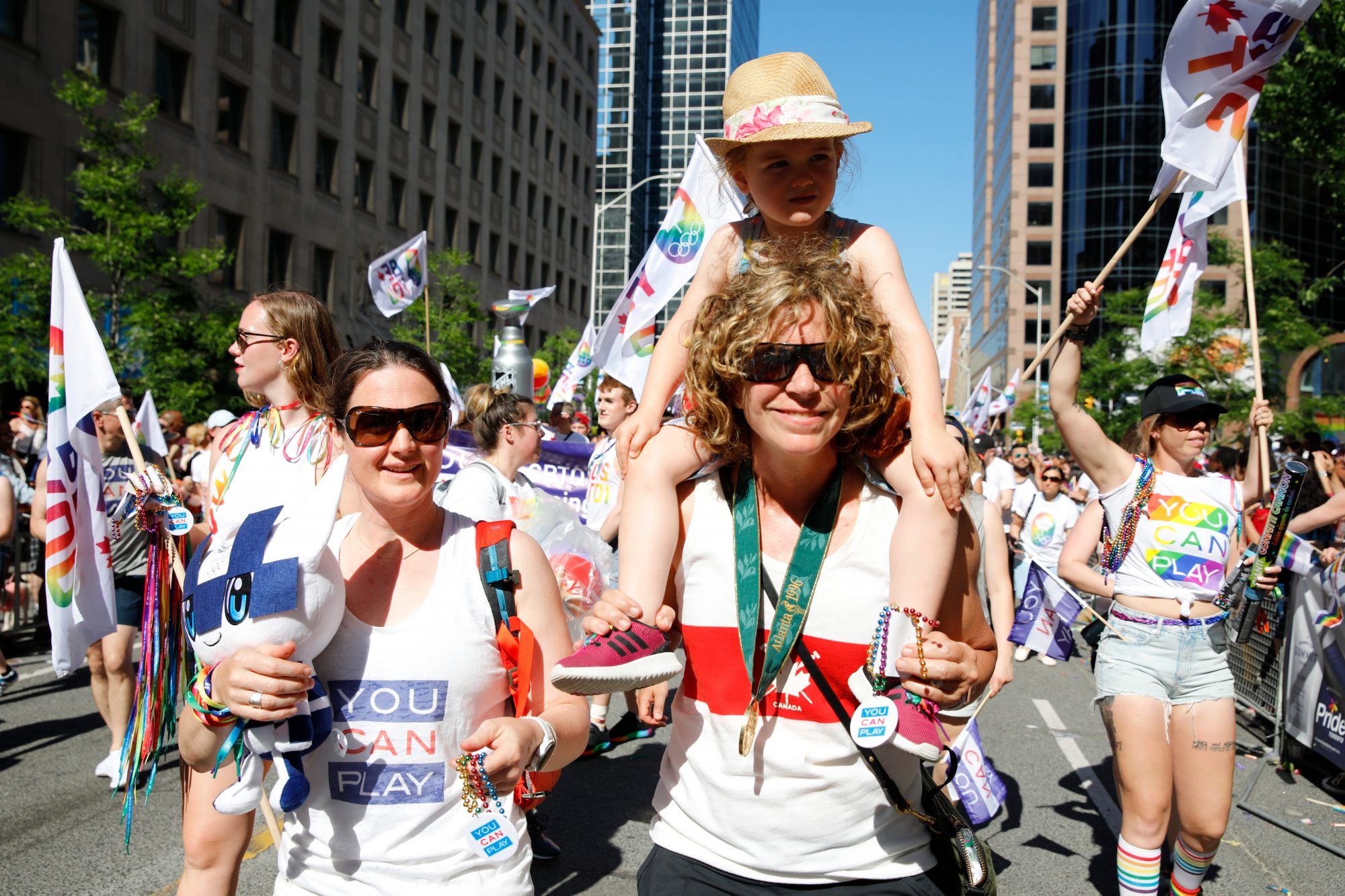 Marnie McBean marches with her wife and daughter as part of Team Canada at the 2019 Toronto Pride Parade on Sunday, June 23, 2019 in Toronto, Ontario (Photo: Adam Pulicicchio/COC).