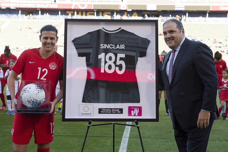 Before the game, Christine Sinclair was given a commemorative jersey and the ball with which she scored her 185th goal to become the world’s all-time leader for international goals.