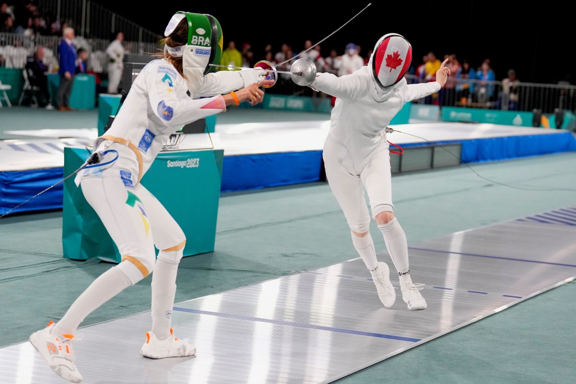 Alexanne Verret of Canada competes against Nathalie Moellhausen of Brazil in Women’s Épée Individual Fencing action during the Santiago 2023 Pan American Games on Wednesday, November 01, 2023. Photo by Candice Ward/COC