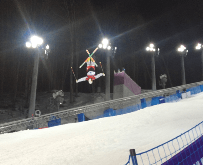 Après avoir été témoin des deux descentes quasi parfaites de Justine et Chloé, c’était au tour de la dernière bosseuse à s’élancer. Hanna Kearney, détentrice du titre olympique, était sur le point d’amorcer sa course. C’est à ce moment que j’ai soudainement réalisé que ma ‘brillante idée’ m’avait éloigné du podium situé au bas de la piste.