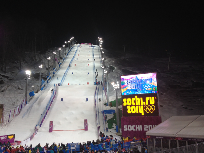 Assigné à couvrir la finale qui avait lieu tard en soirée au Parc extrême de Rosa Khutor, j’ai eu la chance de pouvoir apprécier de près les descentes en or et argent de Justine et Chloé. Ne voulant rien manquer de l’action, j’avais décidé d’emprunter les crampons de notre photographe Jason Ransom dans le but de me rapprocher en m’aventurant aux abords de la montagne vertigineuse.