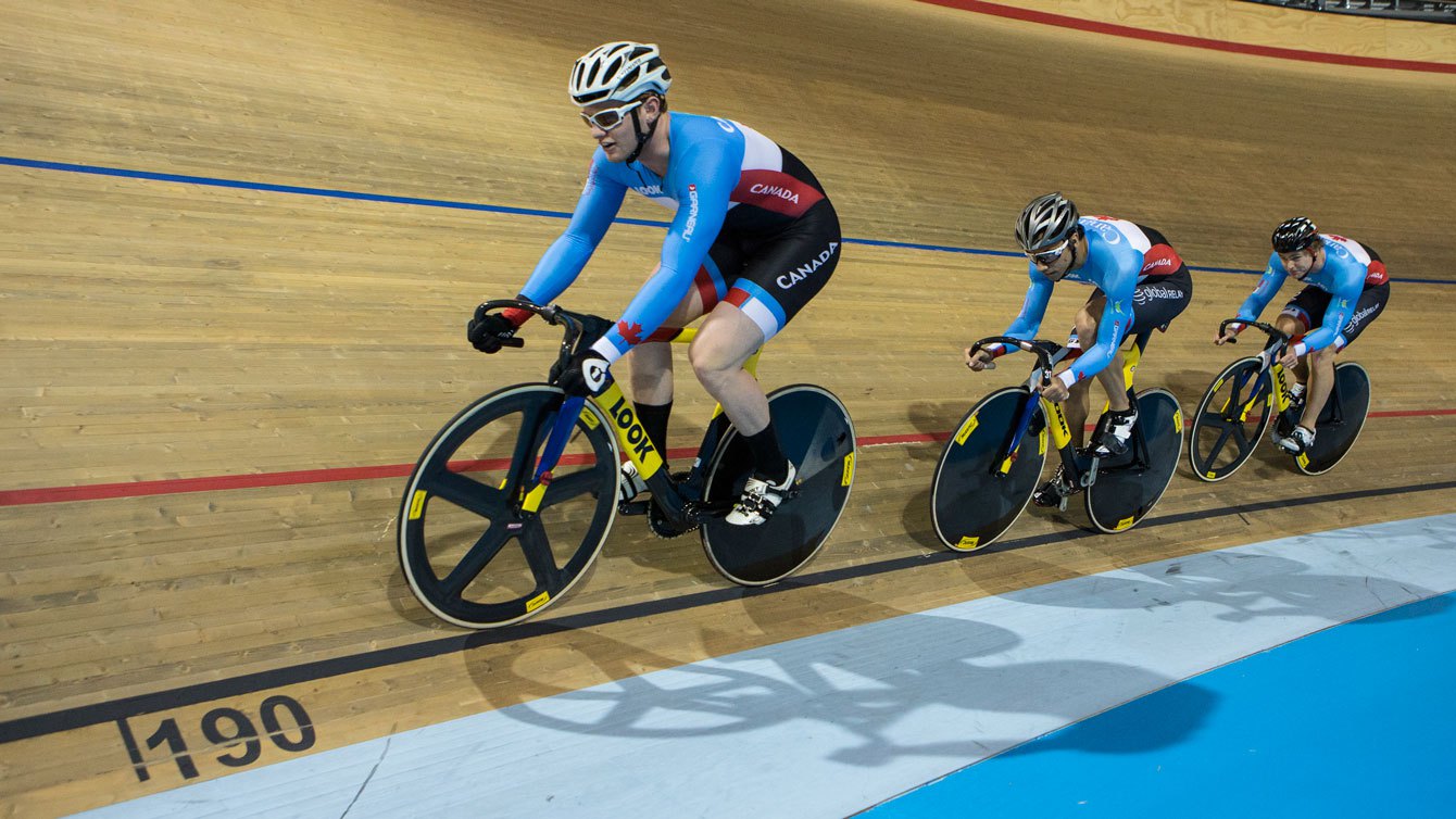 Evan Carey, Joseph Veloce et Hugo Barrette font une démonstration lors de l’annonce pour les Panam d’un sprint en équipe.
