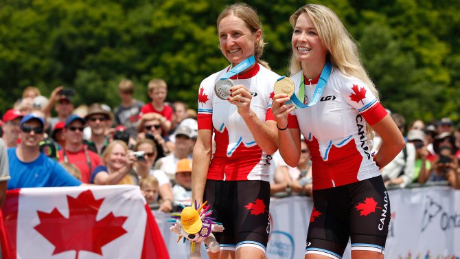 Emily Batty (droite) et Catharine Pendrel célèbrent leur doublé en vélo de montagne aux Jeux panaméricains de Toronto le 12 Juillet 2015.
