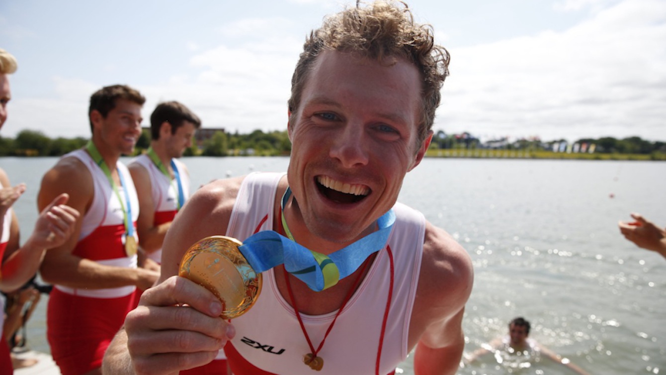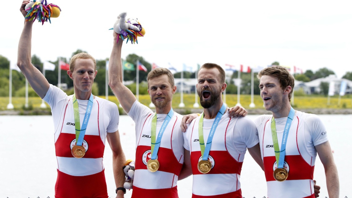 Manchette: L’équipe canadienne du huit de pointe célèbre en lançant le barreur, Jacob Koudys, à l’eau après avoir gagné l’or aux Jeux panaméricains (Photo:David Jackson)