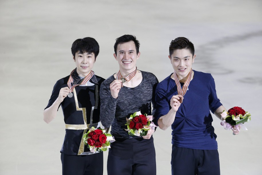 Photo manchette : Patrick Chan (au centre), le médaillé d’argent Jin Boyang (gauche) et le médaillé de bronze Han Yan (droite) prennent la pose pour les photographes lors de la cérémonie des médailles du championnat des Quatre Continents, le 21 février 2016. (AP Photo/Wally Santana)