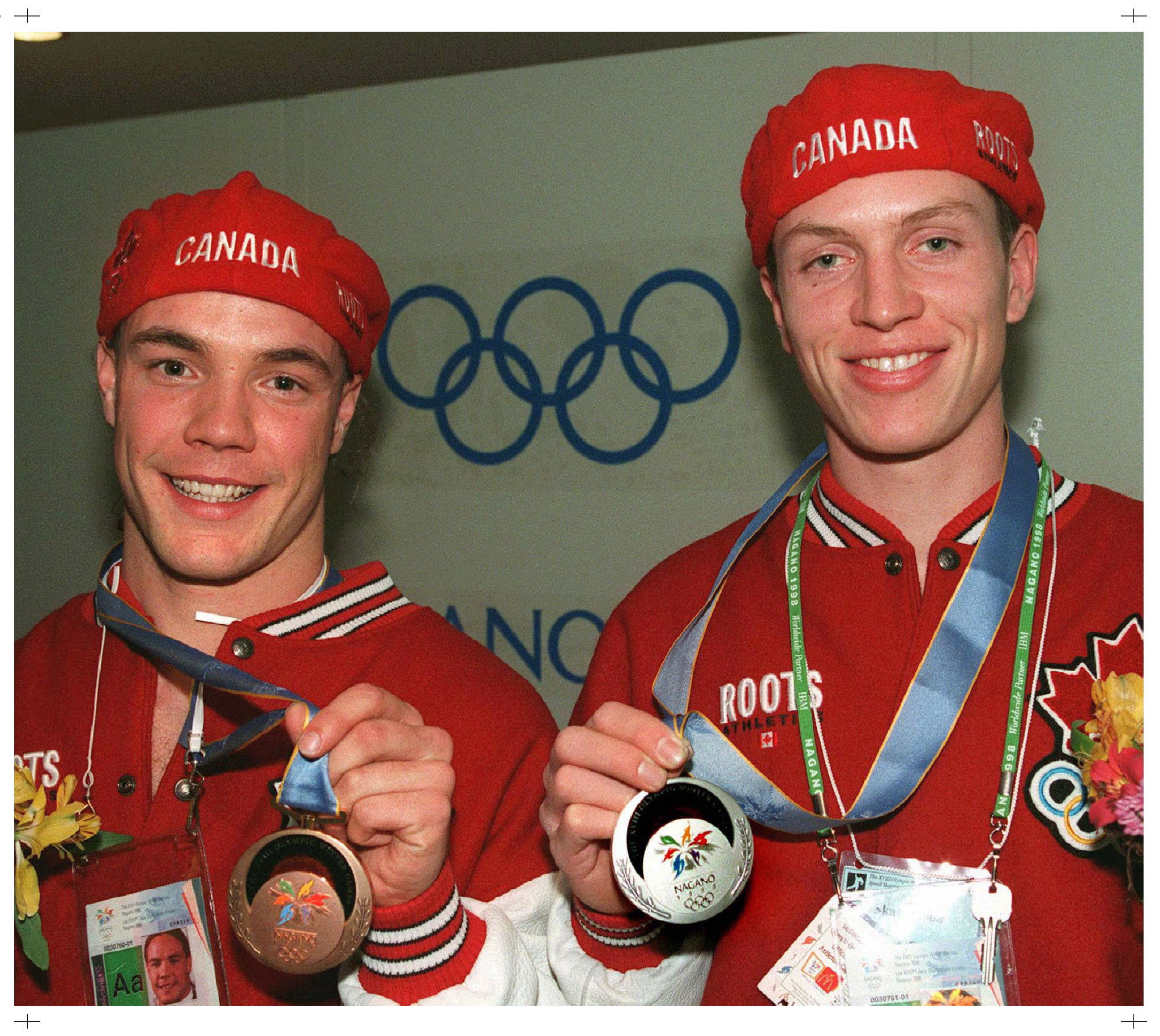 Jeremy Wotherspoon (gauche) et Kevin Overland (droite) du Canada célèbrent après avoir remporté respectivement des médailles d’argent et de bronze en patinage de vitesse longue piste aux Jeux olympiques d’hiver de Nagano de 1998. (Photo PC/AOC)