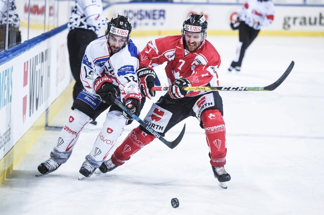 Le joueur suisse Luca Cunti, à gauche, défie le Canadien David McIntyre lors de la dernière partie entre Équipe Canada et Équipe Suisse au 91e tournoi de hockey sur glace de la Coupe Spengler à Davos, en Suisse, le dimanche 31 décembre 2017. (Melanie Duchene / Keystone via AP)