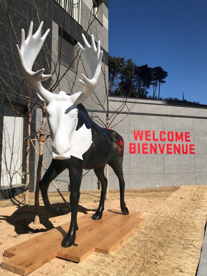 PyeongChang 2018 compte deux villages des athlètes – un situé dans la zone alpine et l’autre, dans la zone côtière – pour que les athlètes puissent habiter le plus près possible de leur site de compétition. Les deux villages possèdent à peu près les mêmes installations, mais Équipe Canada y a érigé deux statues d’orignaux complètement différents. Les deux bêtes (toujours sans nom pour le moment) sont situées tout juste à l’entrée des édifices du Canada. L’orignal du village de la zone alpine arbore un motif de tartan typiquement canadien tandis que l’autre est peint en noir et blanc.