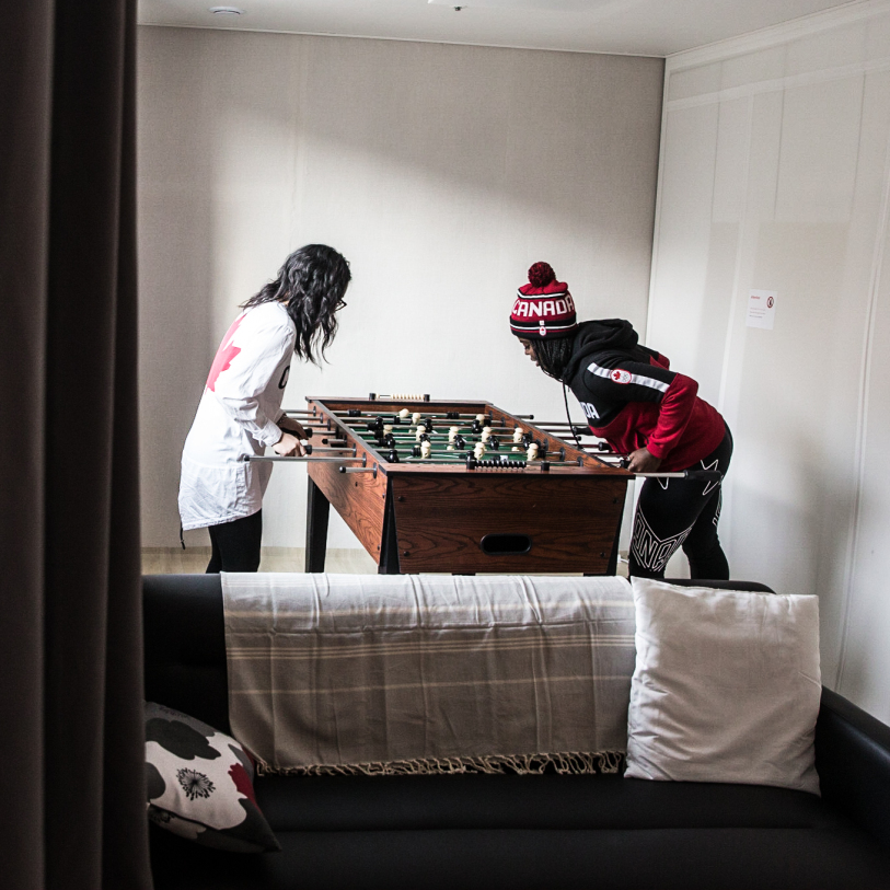 En plus de leurs appartements, les athlètes d’Équipe Canada profiteront du salon des athlètes. Cet endroit est un lieu de rassemblement pour ceux et celles qui souhaitent encourager leurs coéquipiers pendant les Jeux. Ils peuvent aussi s’y rendre pour relaxer, s’étirer et même prendre part à d’autres compétitions amicales en jouant à des jeux vidéo ou des jeux de société.