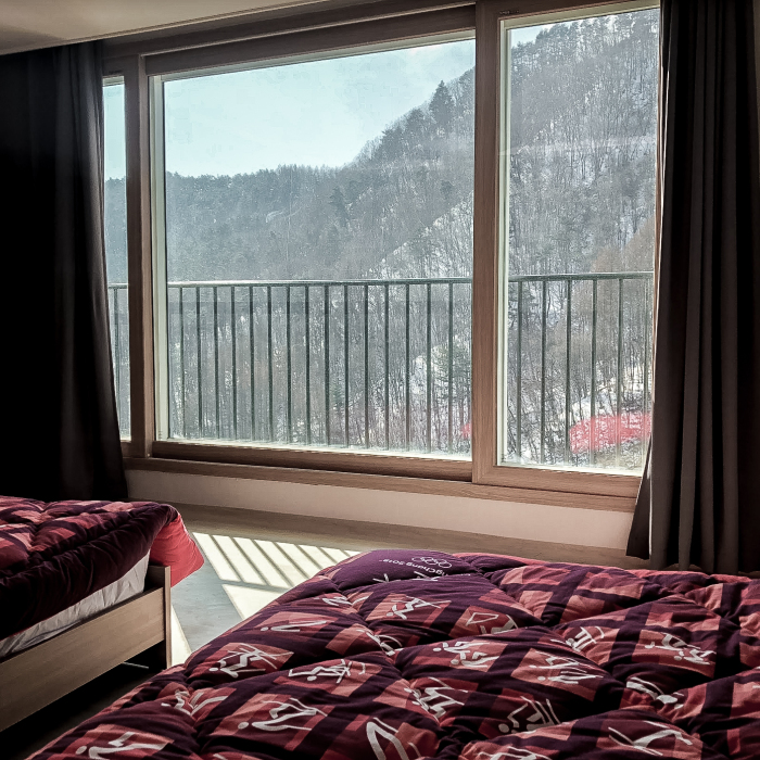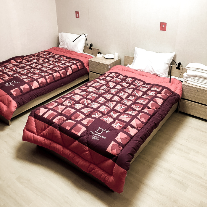 Les athlètes habitent dans des appartements qu’ils partagent avec leurs coéquipiers. Le comité d’organisation de PyeongChang 2018 a équipé chaque chambre d’une couverture à l’effigie des Jeux composée d’une série d’images représentant chacun des sports du programme des Jeux olympiques d’hiver.