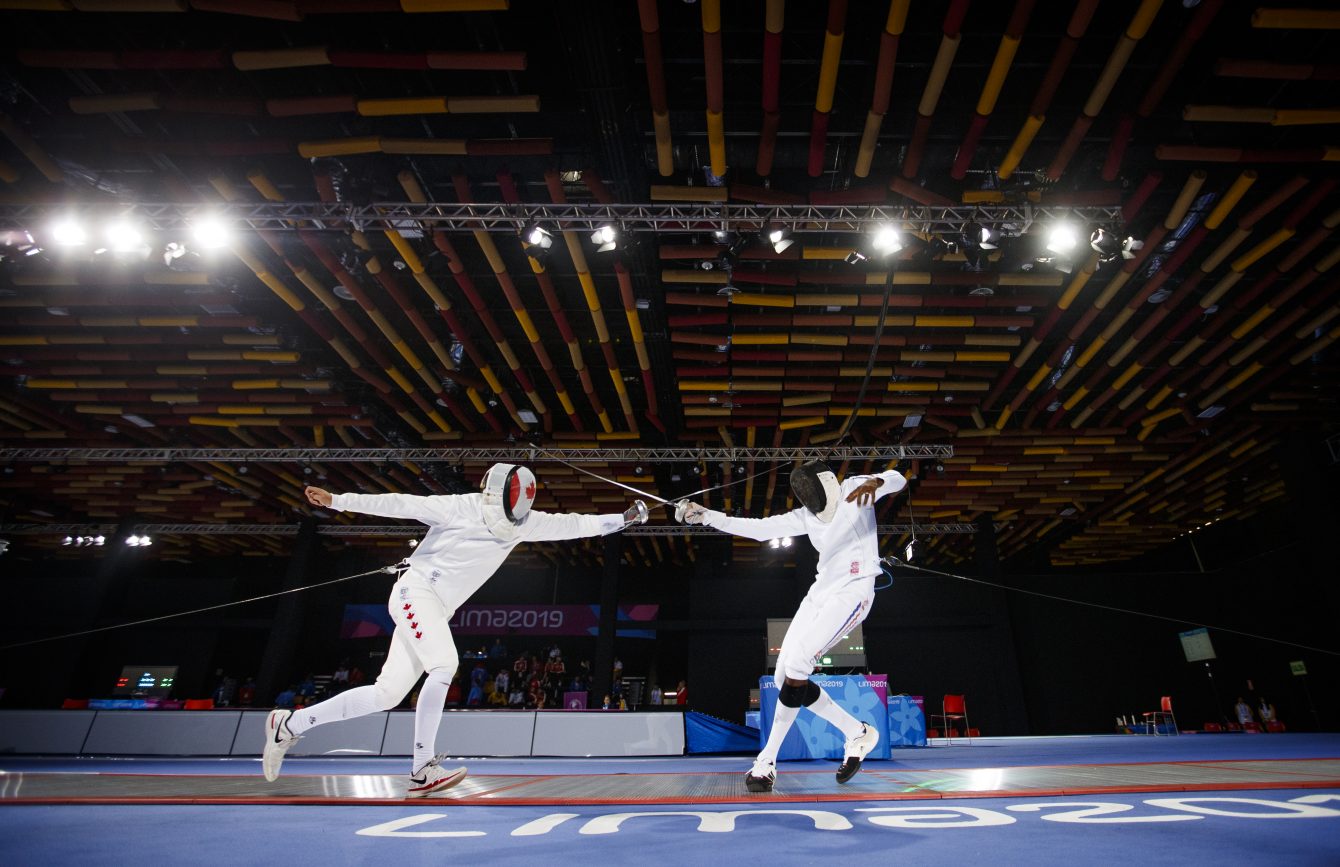 Marc-Antoine Blais Belanger participe à l’épée individuelle aux Jeux panaméricains de Lima, au Pérou, le 5 août 2019. Photo : Christopher Morris/COC