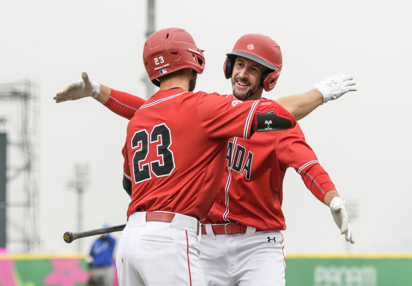 Jonathan Malo célèbre son coup de circuit avec son coéquipier Rene Tosoni contre le Nicaragua aux Jeux panaméricains de Lima, au Pérou, le 3 août 2019. Photo : Vincent Ethier/COC