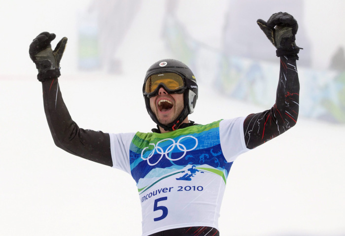 Jasey-Jay Anderson célèbre sa descente digne de la médaille d’or au slalom géant parallèle aux Jeux olympiques de Vancouver, le 27 février 2010. LA PRESSE CANADIENNE/Sean Kilpatrick