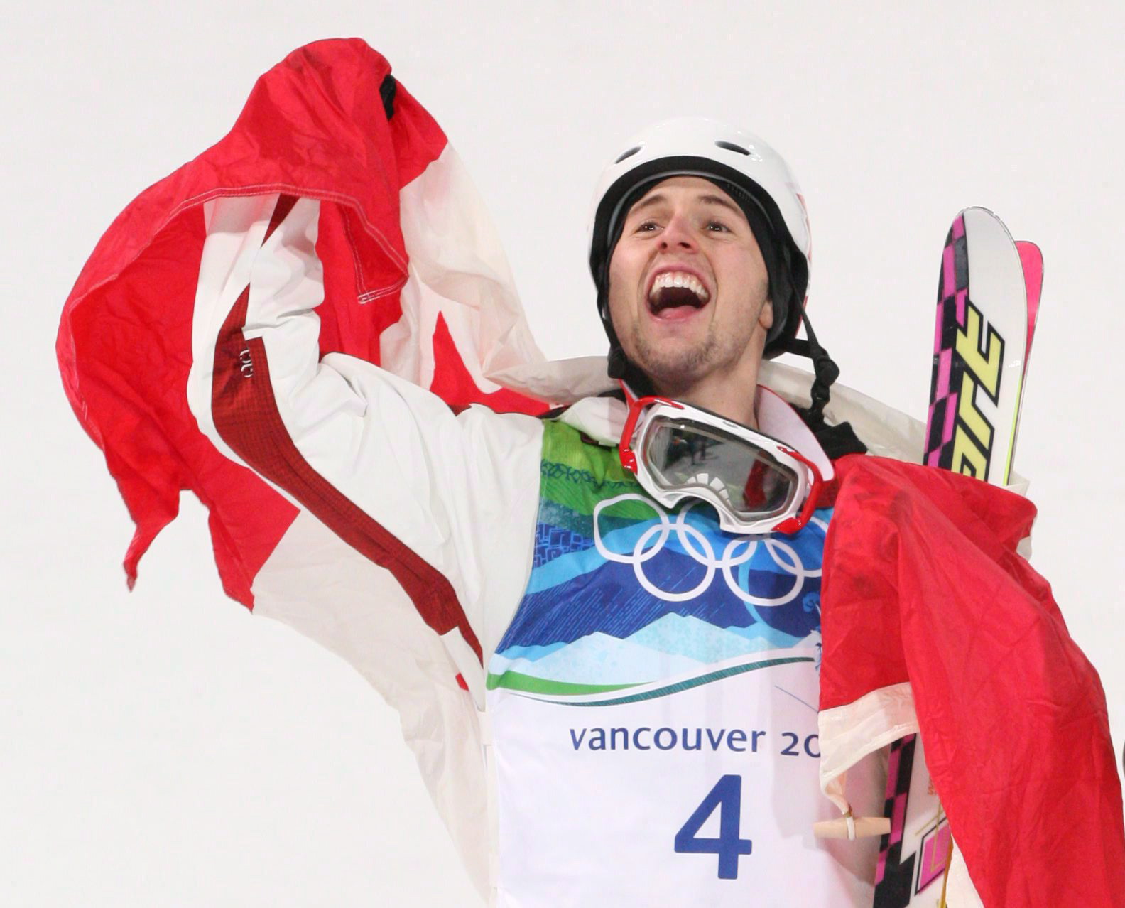 Alexandre Bilodeau célèbre sa médaille d’or en bosses chez les hommes à Vancouver, en Colombie-Britannique, le dimanche 14 février 2010, aux Jeux olympiques d’hiver. LA PRESSE CANADIENNE/Sean Kilpatrick