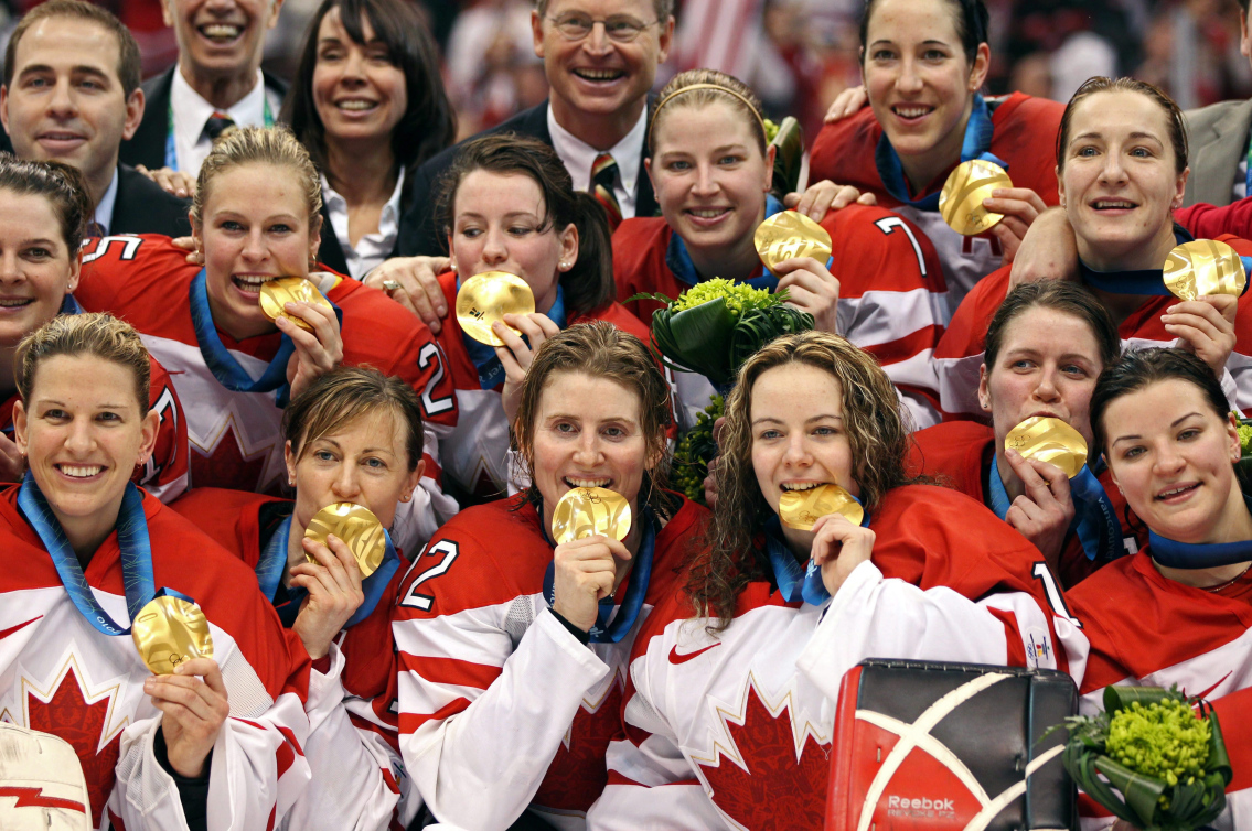 Équipe Canada célèbre avec ses médailles d’or après avoir défait les États-Unis en finale de hockey sur glace féminin aux Jeux olympiques de Vancouver, le 25 février 2010. LA PRESSE CANADIENNE/Jonathan Hayward