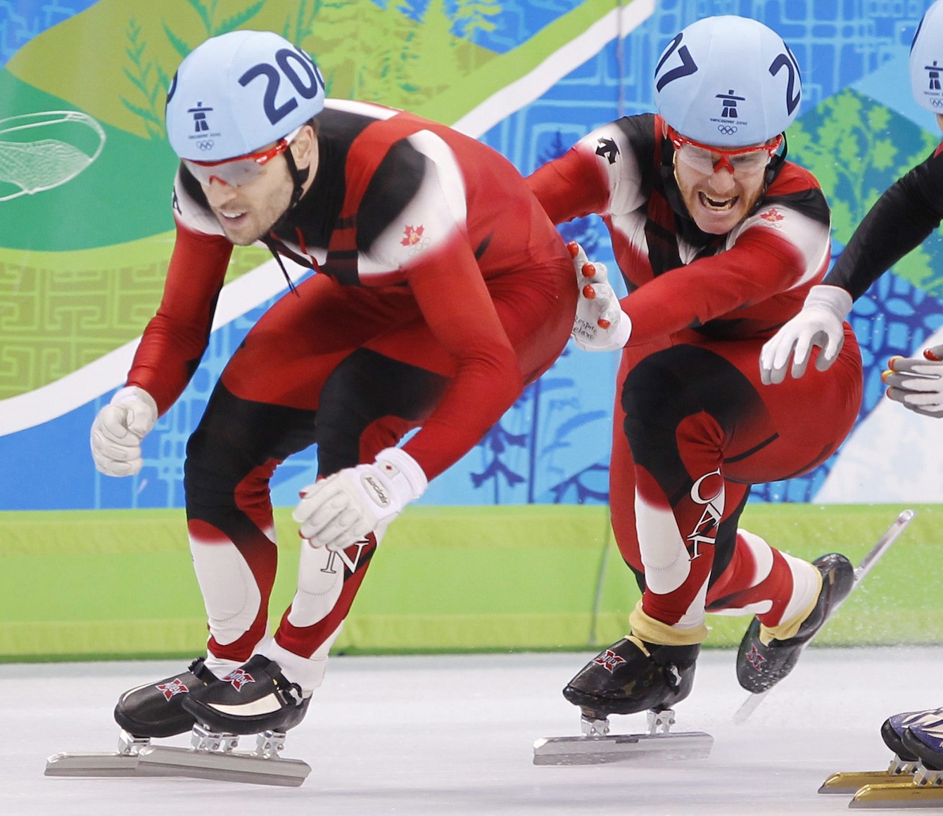Olivier Jean, à droite, pousse son coéquipier François-Louis Tremblay, en route vers l’or au relais masculin 5000 m en courte piste, aux Jeux olympiques de Vancouver, le 26 février 2010. LA PRESSE CANADIENNE/Paul Chiasson