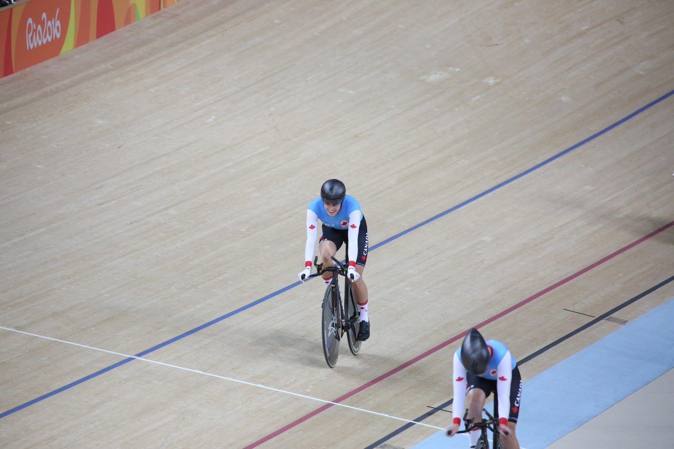 Georgia Simmerling et Allison Beveridge à l’échauffement, avant leur course de poursuite féminine, le 13 août 2016 à Rio. COC Mark Blinch