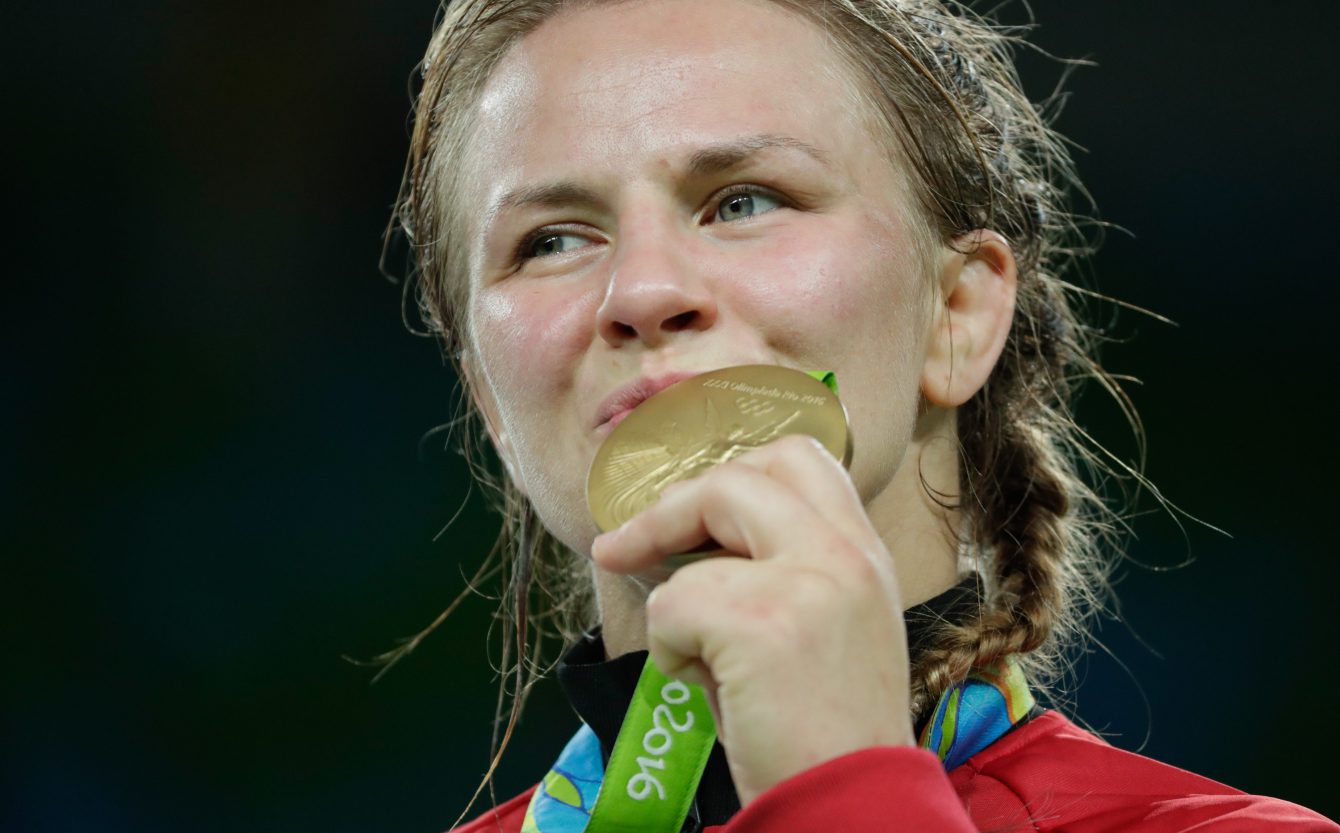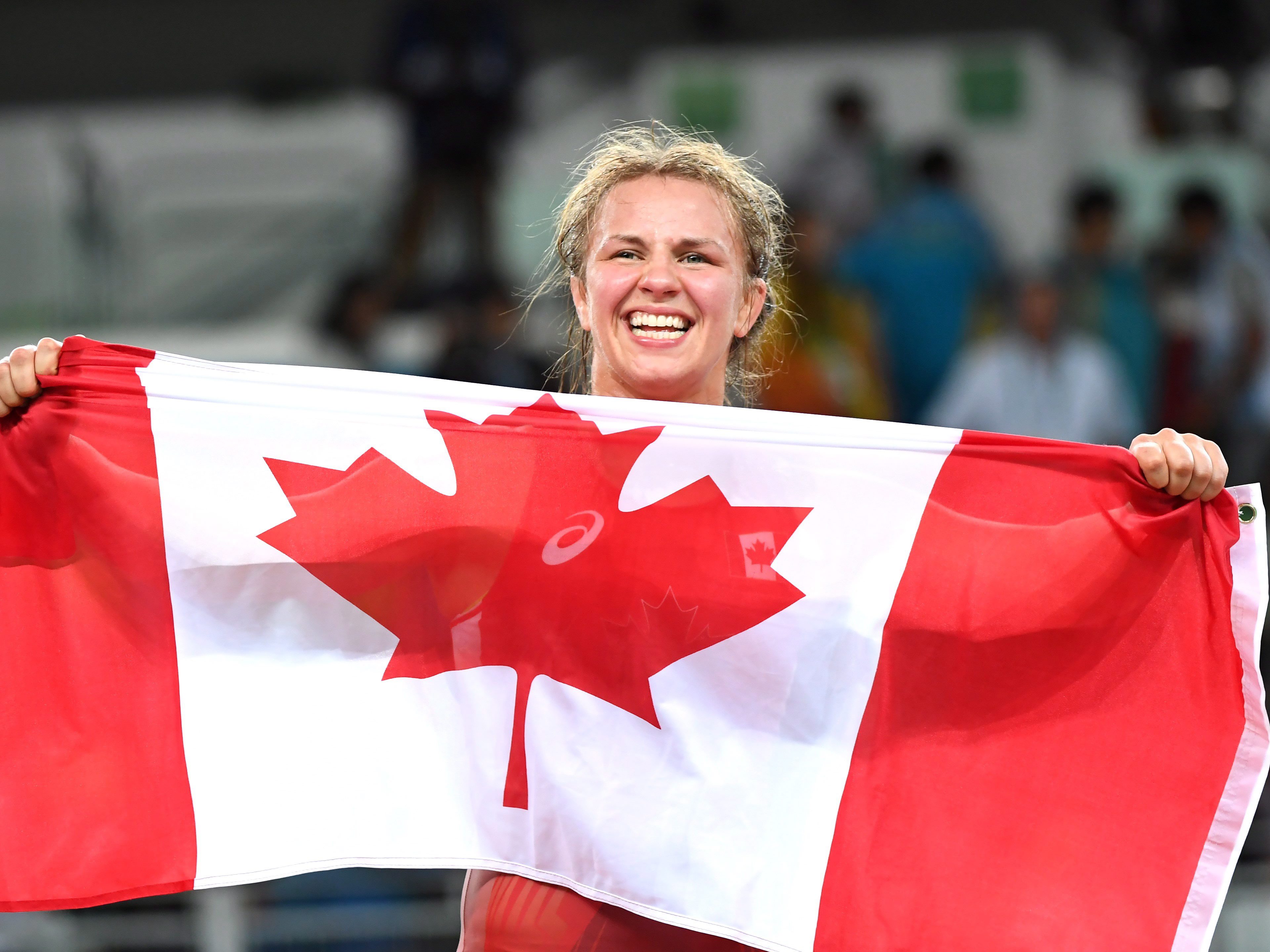 Erica Wiebe célèbre sa médaille d’or chez les 75 kg en lutte, obtenue contre la Kazakhe Guzel Manyurova, le 18 août 2016. COC Jason Ransom
