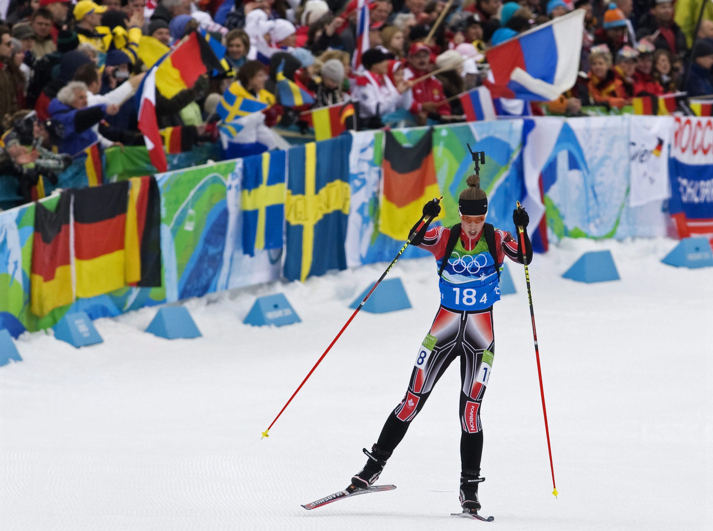 Tania Vicent, Marianne St-Gelais, Kalyna Roberge et Jessica Gregg célèbrent leur médaille d’argent au relais 3000 m féminin aux Jeux olympiques de Vancouver, le 25 février 2010. THE CANADIAN PRESS/Tara Walton