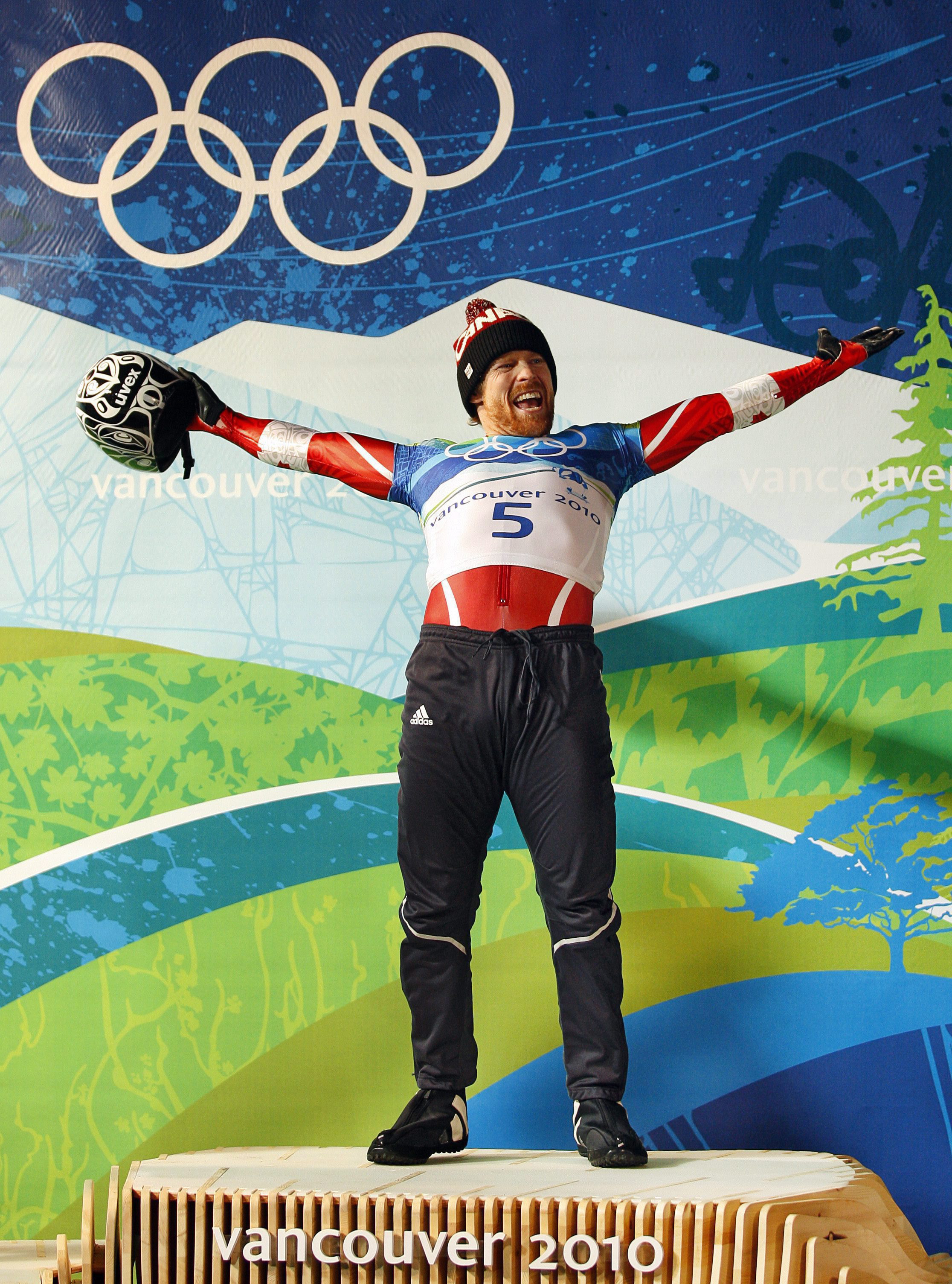 Kaillie Humphries et Heather Moyse c.lèbrent leur médaille d’or avec leurs coéquipières et médaillées d’argent Helen Upperton et Shelley-Ann Brown en bobsleigh à deux féminin aux Jeux olympiques de Vancouver, en février 2010. (COC/Dave Sandford)