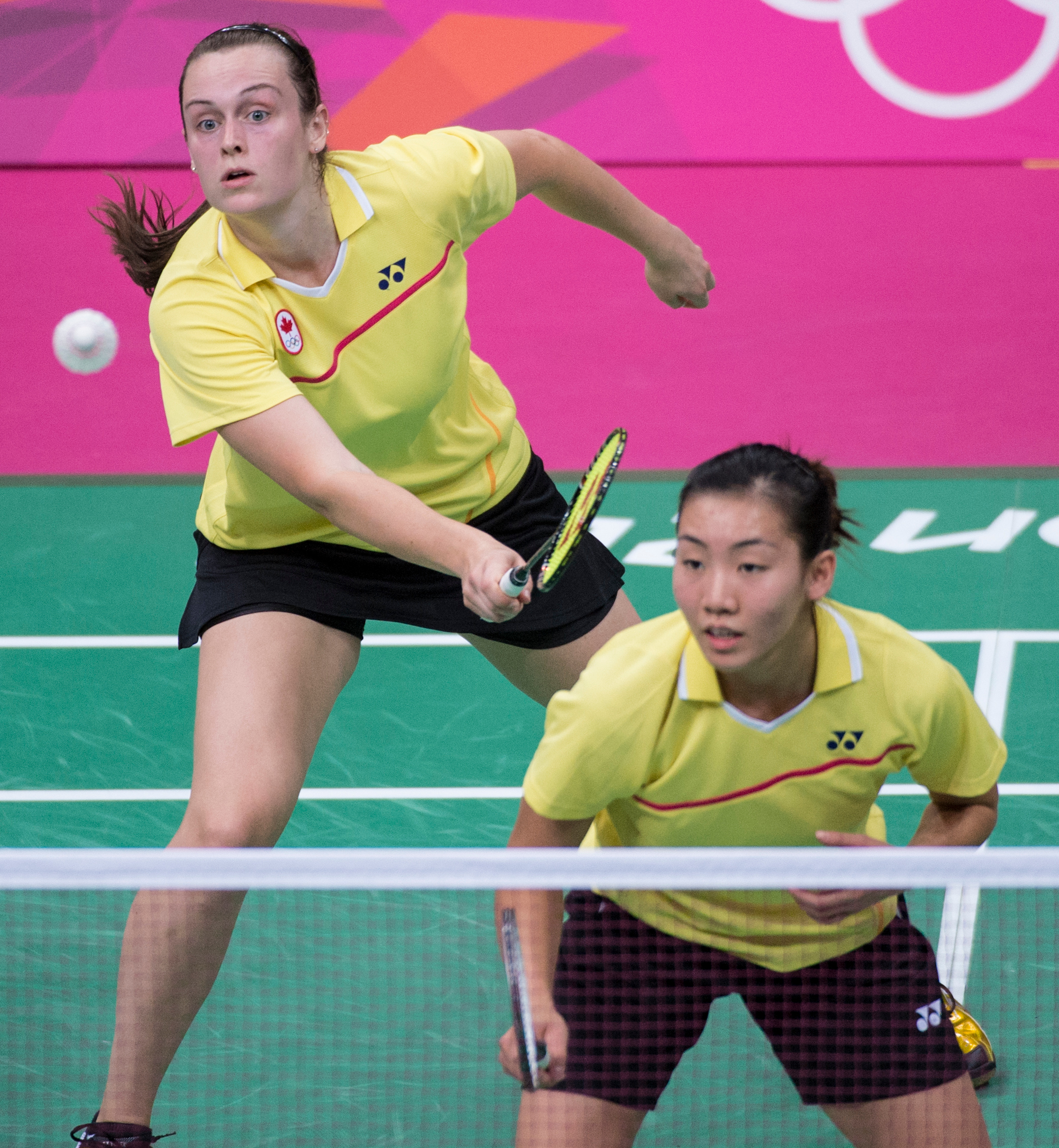 La Canadienne Alex Bruce frappe le volant qui dépasse sa partenaire Michelle Li lors du match de demi-finale de badminton qu’elles ont disputé contre les Japonaises Reika Kakiiwa et Mizuki Fuji aux Jeux olympiques de 2012 à Londres, le 2 août 2012. Bruce et Li ont perdu le match par deux manches à une.