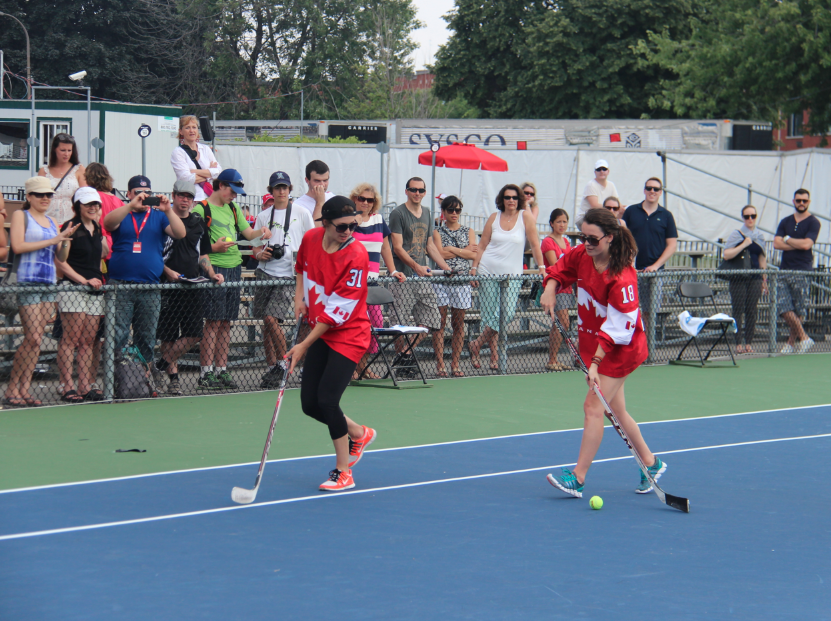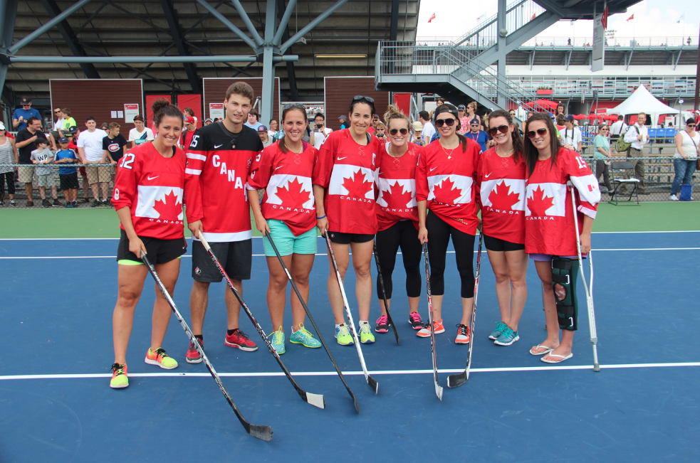 Mélodie Daout, Catherine Ward, Caroline Ouellette, Marie-Philip Poulin, Geneviève Lacasse, Charline Labonté et Lauriane Rougeau, accompagné du gardien de l’équipe junior du Canada Zach Fucale, se sont donnés en spectacle lors d’un match amical contre des joueuses de la WTA dans le cadre de la Coupe Rogers à Montréal.