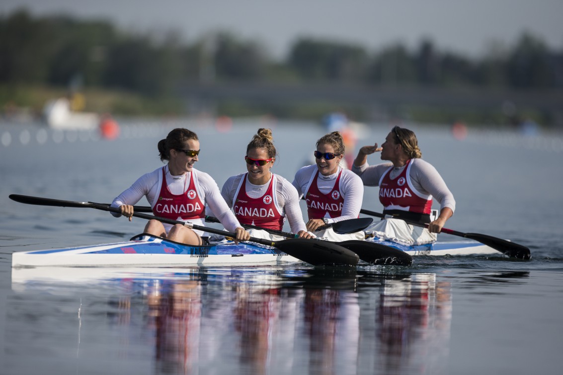 Members of Canada’s K4 500m team celebrate winning the first gold medal of the Pan Am Games in Toronto. Photo by Michael P. Hall