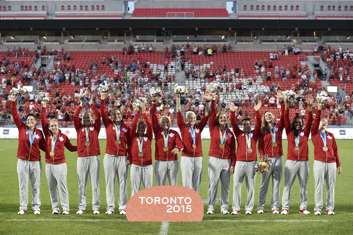 USA receives gold, while Canada receives silver, and Brazil bronze in women’s artistic gymnastics team competition, at Toronto Coliseum July 12, 2015.