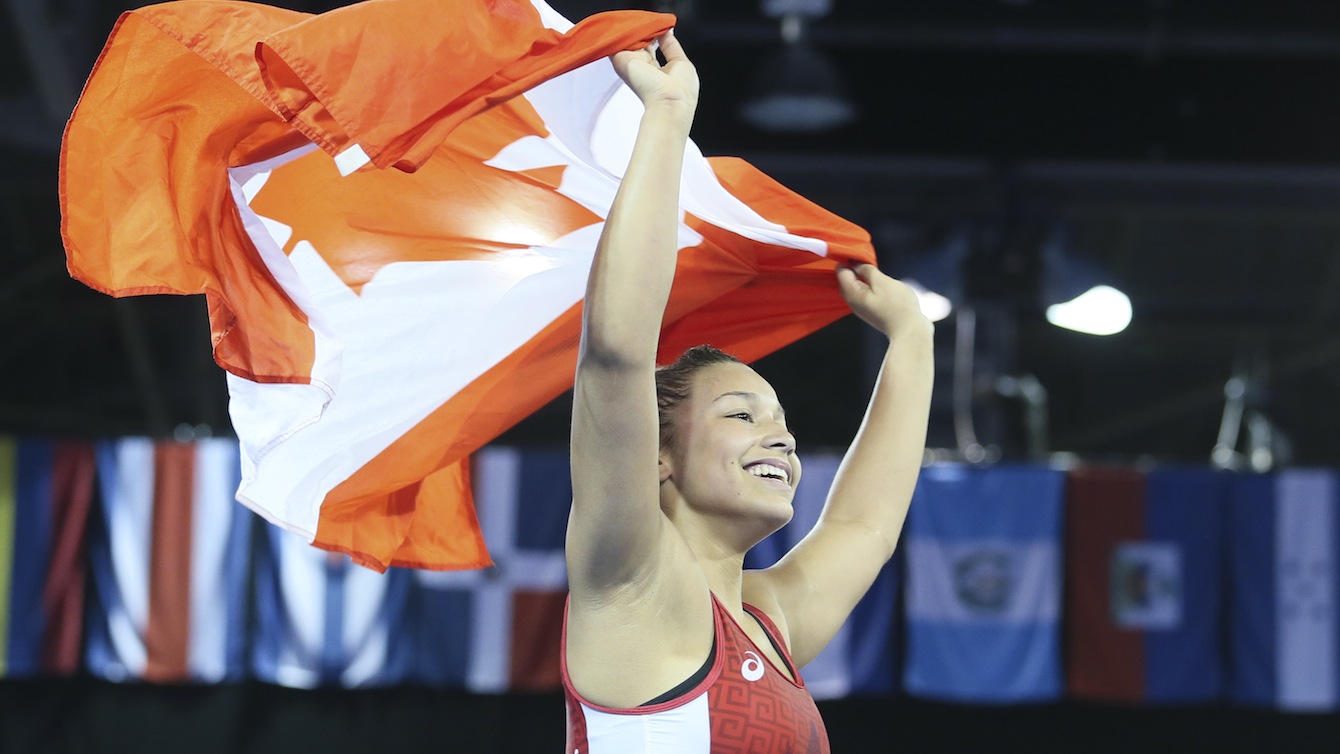 Justine Di Satsio (red) of Coquitlam, B.C. was the silver medalist in the freestyle wrestling 75 kg. final round at the PanAmerican Games in Mississauga, Ont.