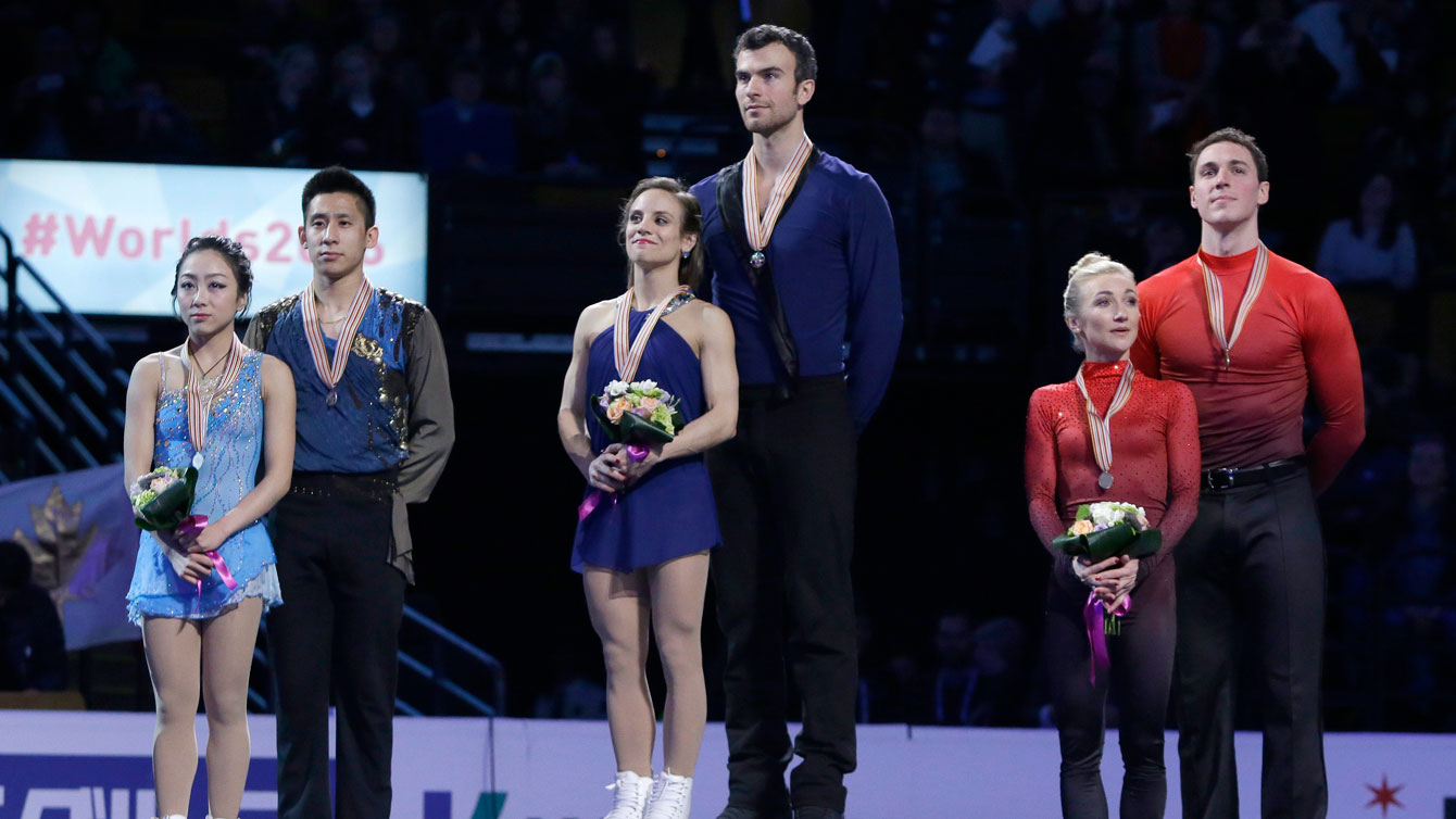 Meagan Duhamel and Eric Radford (centre) stand atop the pairs gold medal spot at the ISU Figure Skating World Championships podium ceremony on April 2, 2016.