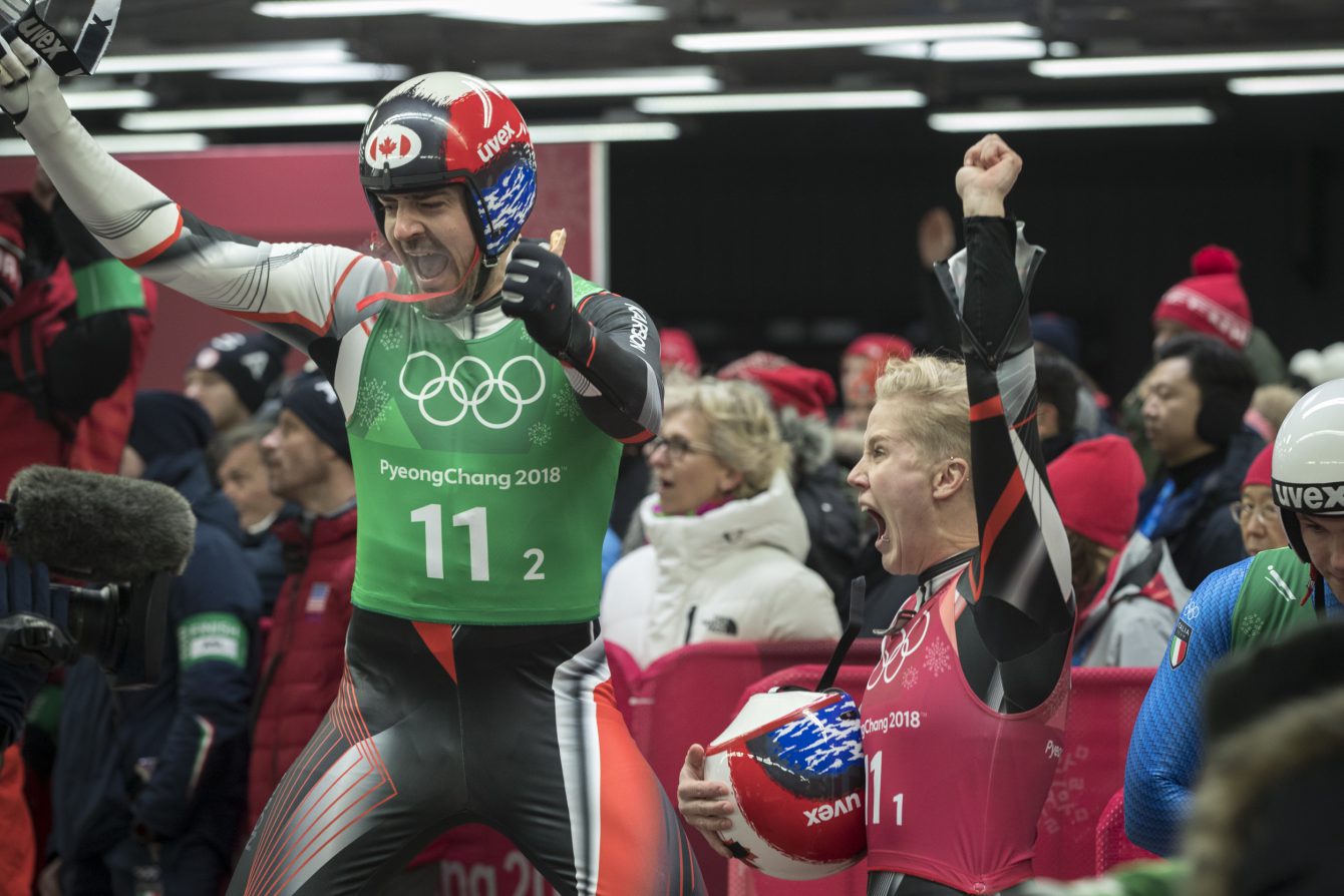 Team Canada Luge Relay team wins Silver at the Alpensia Sliding Centre during the Winter Olympic Games, in Pyeongchang, South Korea, Thursday, February 15, 2018. Photo/David Jackson