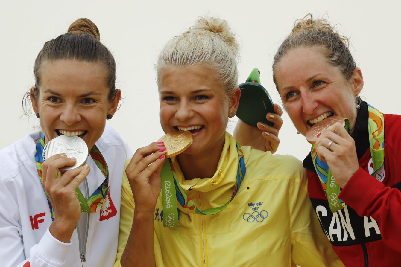 Gold medalist Jenny Rissveds of Sweden, center, silver medalist Maja Wloszczowska of Poland, left, and bronze medalist Catharine Pendrel of Canada, right, bite they medals on the podium of the women’s cross-country mountain bike race at the 2016 Summer Olympics in Rio de Janeiro, Brazil, Saturday, Aug. 20, 2016. (AP Photo/Patrick Semansky)